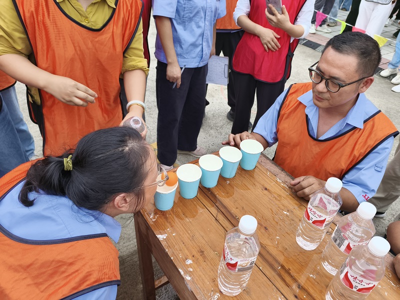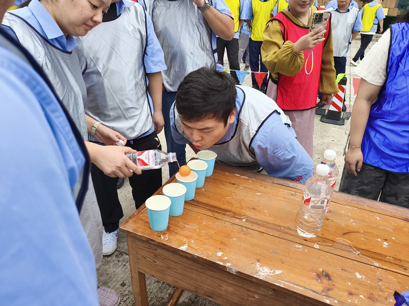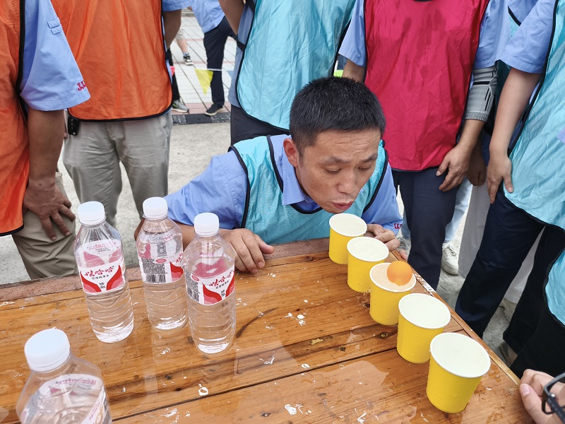 “四渡赤水”項目率先拉開競技序幕,每隊4名隊員需在“水與球”的考驗中復(fù)刻紅軍“靈活機動”的戰(zhàn)術(shù)精髓?;顒蝇F(xiàn)場,長桌之上整齊排列著接滿清水的紙杯,首杯中的乒乓球如同“紅軍主力”,隊員需用嘴吹氣推動其依次“渡河”至下一杯中,中途掉落則需“重新部署”。4名隊員輪流上陣,四輪接力間,賽場邊的加油聲此起彼伏。最終,用時最短的隊伍憑借穩(wěn)定的心態(tài)與默契的配合,率先“突破重圍”,讓大家真切體會到當年紅軍四渡赤水時“聲東擊西、化險為夷”的不易。