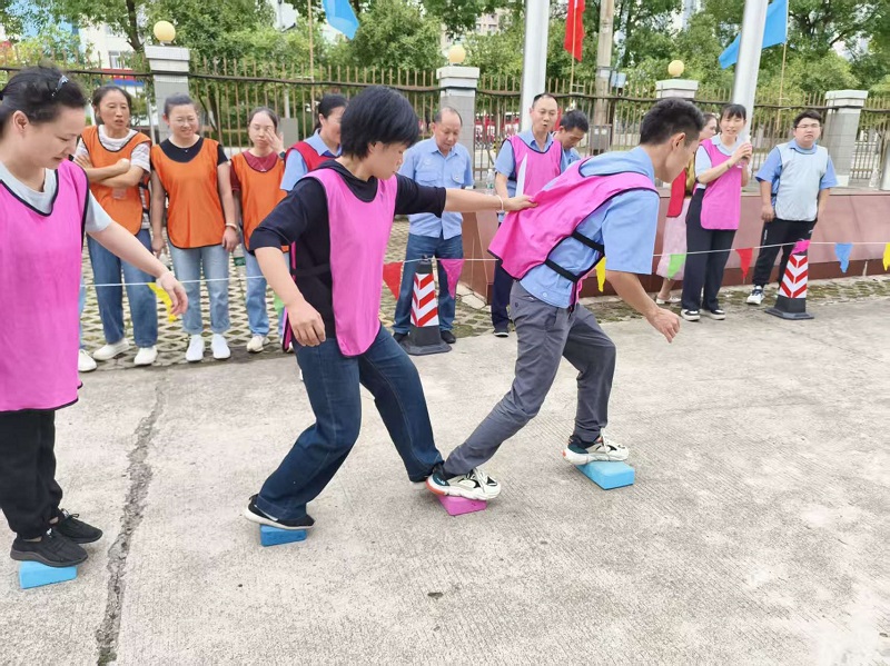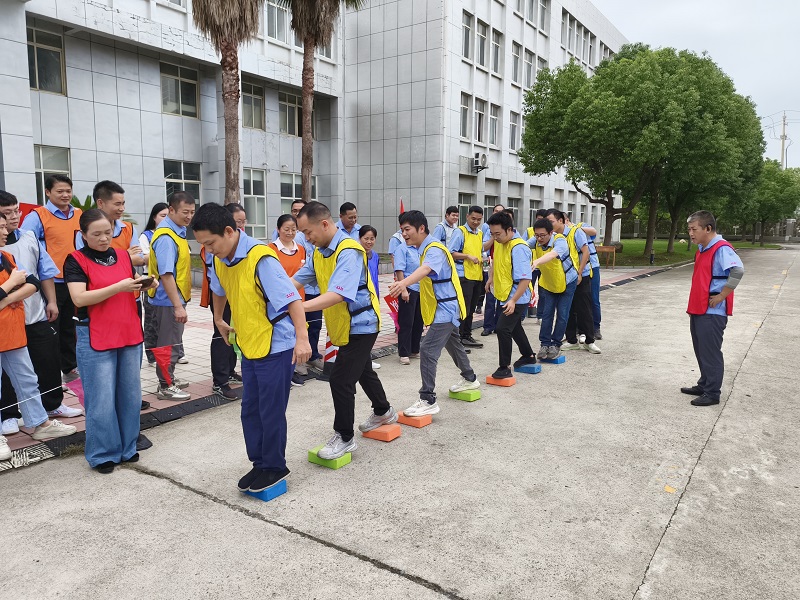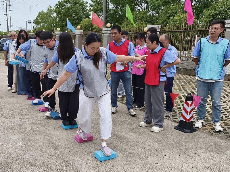 緊隨其后的“飛奪瀘定橋”項目,將競技氛圍推向高潮。每隊8名隊員化身“紅軍戰(zhàn)士”,需借助9塊“木板”(磚頭)跨越“天險”,全員抵達終點即為成功,中途踩地一次則“貽誤戰(zhàn)機”,加時3秒。各隊迅速制定“作戰(zhàn)計劃”,8人一組的隊伍如同一條緊密相連的“戰(zhàn)斗鏈條”,每一步移動都凝聚著集體的智慧。參賽員工齊心協(xié)力,團結(jié)一心,完美詮釋了“晝夜奔襲二百四”的瀘定橋精神。