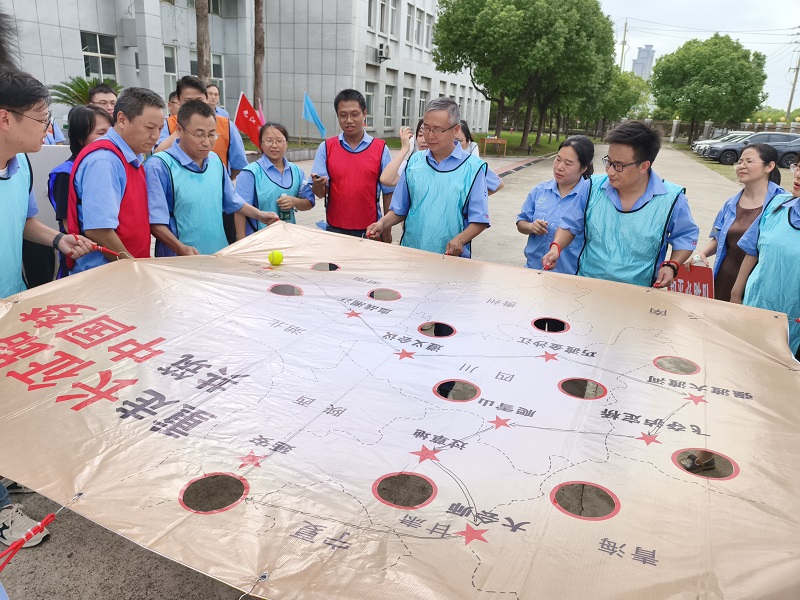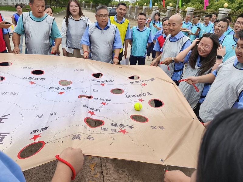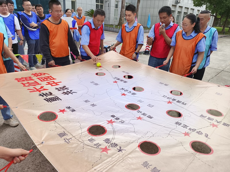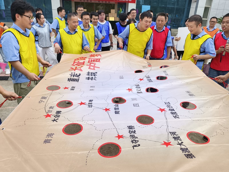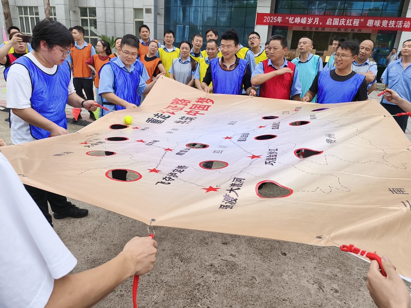 作為壓軸項目的“重走長征路”,更是將紅色精神的傳承推向深處。每隊9名隊員共同拉平印有“中央紅軍路線圖”的畫布,隊長在“瑞金”起點放置網(wǎng)球代表“中央紅軍”,隊員需通過默契配合控制畫布的高低傾斜幅度,推動“紅軍”沿著長征路線前進,最終抵達“延安”終點小洞。若小球從途中小洞墜落,則“長征受挫”,需重新出發(fā)。此項目極其考驗參賽隊友的配合,以及大家心態(tài)的穩(wěn)定。當網(wǎng)球成功落入“延安”小洞時,現(xiàn)場爆發(fā)出熱烈的歡呼,這一刻,大家不僅贏得了比賽,更在協(xié)作中讀懂了“堅持到底、永不放棄”的長征精神。
